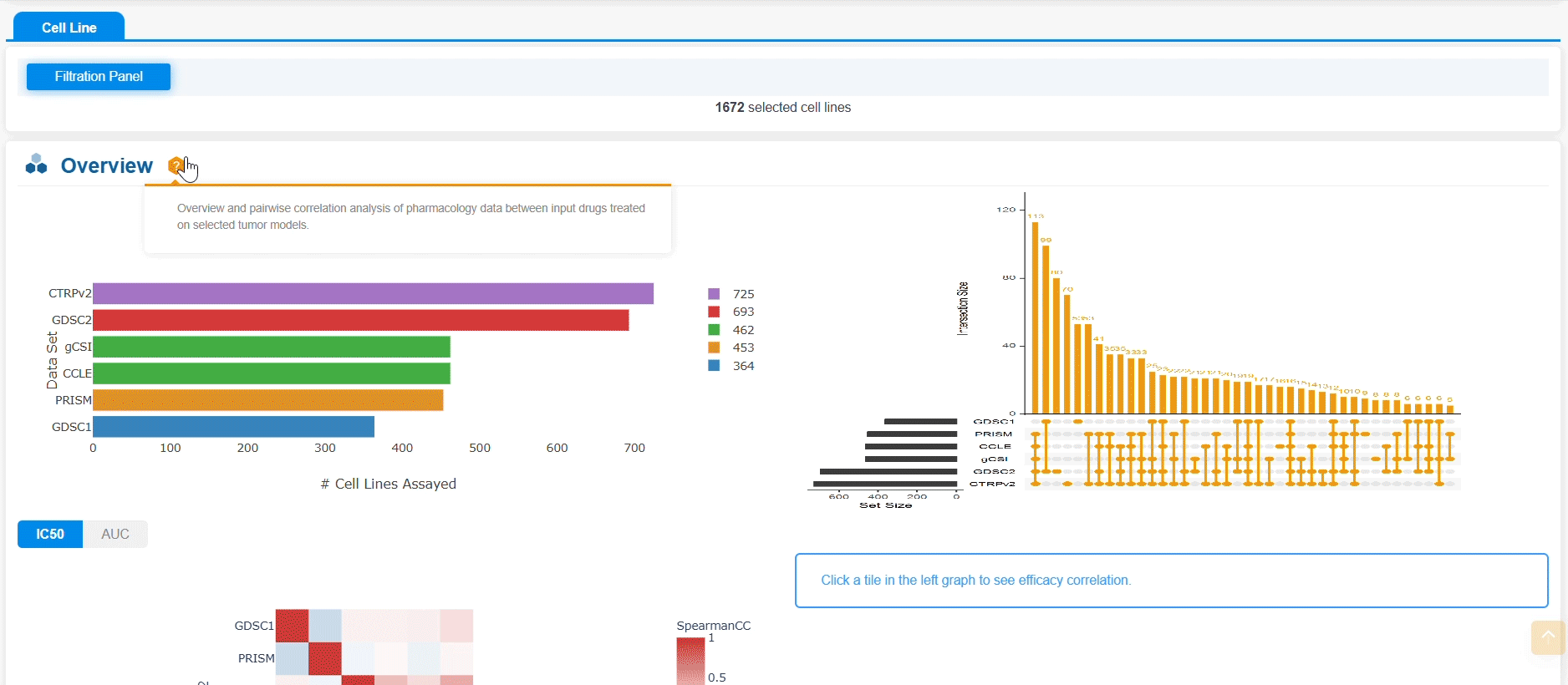 3.查看目標藥物的可用數(shù)據(jù)集:左上圖顯示每個數(shù)據(jù)集中針對該藥物測試的模型數(shù)量;右上圖展示多個數(shù)據(jù)集中共同測試的模型數(shù)量;左下圖基于IC50或AUC測量的療效,展示數(shù)據(jù)集間的成對相關性。點擊左下圖中的任意圖塊,將在右下圖生成對應的療效相關性圖。