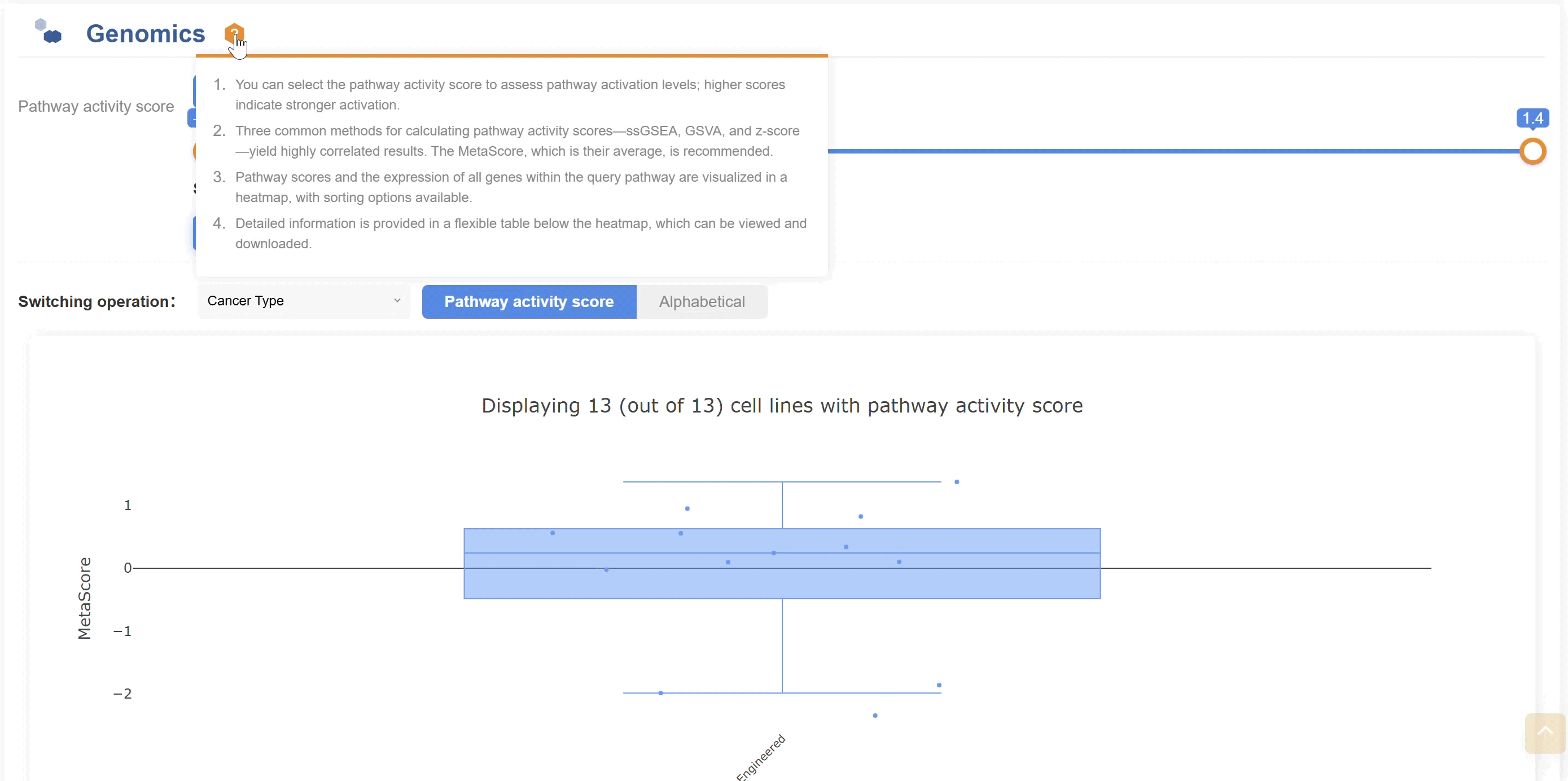 3.滑動選擇通路活性評分范圍以評估通路激活水平——評分越高對應激活越強。三種主要計算方法(ssGSEA、GSVA和z-score)顯示出強相關性;建議采用其平均值——MetaScore。點擊“篩選”應用選擇,或點擊“重置”清除并重新開始。