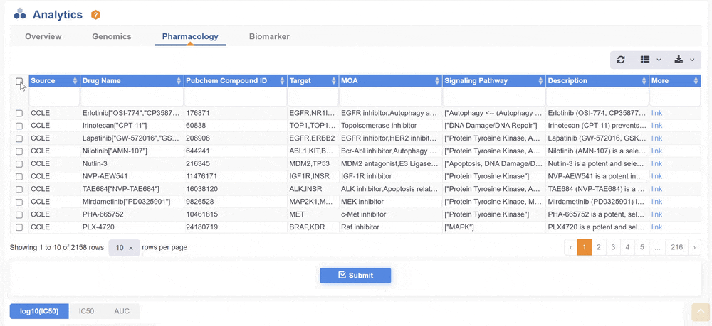 5.為更清晰地展示功能特性,我們已選取所有癌癥類型的細胞系進行展示。詳細信息以靈活表格形式呈現(xiàn),您可添加各類通路活性評分,并按模型、癌癥類型及其他標準進行篩選。所有數(shù)據(jù)均可查看與下載。