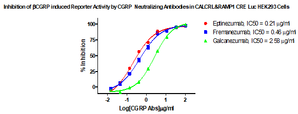 Figure 5. Inhibition of βCGRP induced Reporter Activity by CGRP Neutralizing Antibodies in CALCRL&RAMP1 CRE Luc HEK293 Cells.