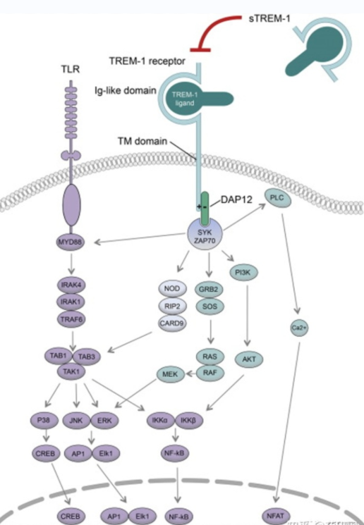 在TREM1被激活后,與其相關(guān)的DAP12蛋白含有ITAMs的胞質(zhì)部分在其酪氨酸殘基上磷酸化,然后與ZAP70和SYK蛋白結(jié)合,使其磷酸化。SYK促進(jìn)包含Cbl、SOS和GRB2的適應(yīng)性復(fù)合物的招募和酪氨酸磷酸化,從而通過(guò)PI3K、PLC-Gamma和ERK途徑導(dǎo)致下游信號(hào)轉(zhuǎn)導(dǎo)。這些途徑誘導(dǎo)Ca2 +動(dòng)員,重新排列肌動(dòng)蛋白細(xì)胞骨架和激活轉(zhuǎn)錄因子,如Elk1、NFA、AP1、c-Fos、c-Jun和Nf-κB,這些轉(zhuǎn)錄因子編碼促炎癥細(xì)胞因子、趨化因子和細(xì)胞表面分子。此外,TREM1誘導(dǎo)的PI3K和ERK途徑的激活可以通過(guò)滅活促凋亡因子來(lái)促進(jìn)線(xiàn)粒體的完整性和細(xì)胞生存:BID、BAD和BAX,并抑制CytoC從線(xiàn)粒體釋放。