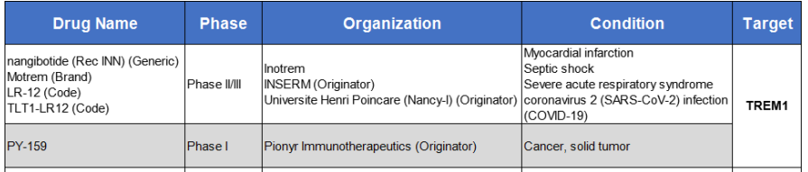 TREM1作為一個(gè)新靶點(diǎn),全球范圍內(nèi)披露的研發(fā)管線(xiàn)不多,針對(duì)TREM1靶點(diǎn)有2款產(chǎn)品進(jìn)入臨床,1款產(chǎn)品即將進(jìn)入臨床(Celsius公司的CEL383,適應(yīng)癥為炎癥性腸?。?。適應(yīng)癥主要為急性感染性疾病、自身免疫性疾病和癌癥。目前TREM1靶點(diǎn)針對(duì)癌癥的臨床前藥物比較活躍的是nangibotide(處于臨床II/III期)及PY-159(處于臨床I期)。其中較引人關(guān)注的是Pionyr Immunotherapeutics公司的TREM1抗體PY159正在與帕博利珠單抗聯(lián)合用于晚期實(shí)體瘤患者的Ia/Ib期研究。PY159 是一種人源化單克隆抗體,能特異性地結(jié)合表達(dá)在髓系細(xì)胞上的TREM1,并通過(guò)交聯(lián)TREM1/DAP12 復(fù)合物誘導(dǎo)下游信號(hào)傳導(dǎo),發(fā)揮激動(dòng)劑的作用。2023年 ASCO報(bào)道的 PY159 的用于冷腫瘤相關(guān)瘤種的I期的臨床研究,結(jié)果顯示總體安全性可控,療效方面 ORR 為 6%,DCR 為 33%,其中胰腺癌患者展現(xiàn)出較好的療效??偟膩?lái)說(shuō),TREM1靶點(diǎn)藥物的作用機(jī)理和效果還不是非常明確,正在研發(fā)的藥物療效也不是很出色,未來(lái)前景還值得繼續(xù)觀(guān)察。