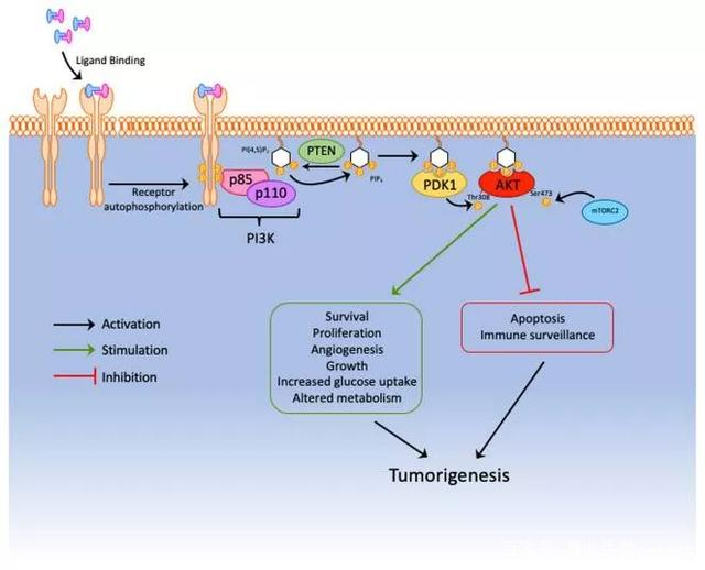 圖1. PTEN抑制PI3K途徑和AKT的下游致癌信號。通過使PIP3磷酸化,PTEN阻止了PDK1激活AKT,從而防止了腫瘤的發(fā)生。