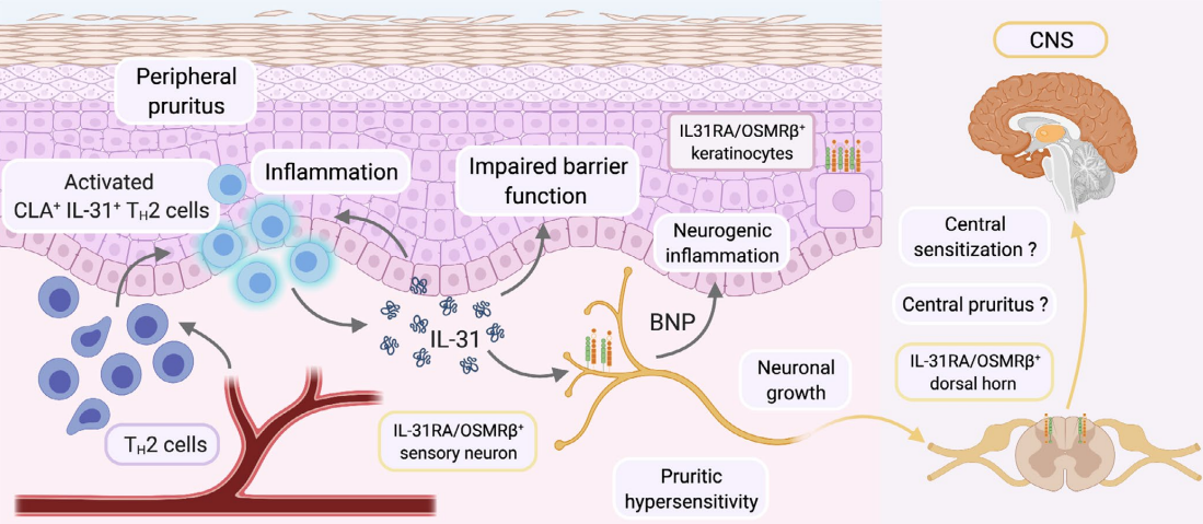 CLA T2細(xì)胞是特應(yīng)性皮炎(AD)患者循環(huán)中豐富的過敏原反應(yīng)性T細(xì)胞,通過CCL17和CCL22信號被募集到AD感染的皮膚。在皮膚中,CLA T2細(xì)胞分泌IL-31,進(jìn)而激活表達(dá)IL31RA/ OSMR β-的皮膚感覺神經(jīng)、天然免疫細(xì)胞(包括DC)、單核細(xì)胞和嗜酸性粒細(xì)胞以及角質(zhì)形成細(xì)胞。在AD皮膚中,角質(zhì)形成細(xì)胞顯示IL31RA/OSMRβ表達(dá)水平升高,導(dǎo)致對IL-31的接受性增強(qiáng)。皮膚IL-31信號通過IL-31介導(dǎo)的終分化基因(如聚絲蛋白和脂質(zhì)包膜減少)的抑制,導(dǎo)致外周瘙癢、(神經(jīng))炎癥和屏障功能受損?;罨慕琴|(zhì)形成細(xì)胞分泌各種化學(xué)引誘劑,觸發(fā)表達(dá)IL -31的CLA Tu2細(xì)胞額外募集到炎癥部位,形成皮膚炎癥和瘙癢的反饋循環(huán)。人和犬的感覺神經(jīng)元表達(dá)IL31RA/ OSMRβ主要在TRPV1共表達(dá)的神經(jīng)元中。IL-31與IL31RA/ OSMR β結(jié)合后,通過下游信號通路上調(diào)瞬時(shí)受體電位香草酸受體1(tansient receptor potential vanilloid,TRPV1)及瞬時(shí)受體電位受體A1(TRPA1)表達(dá),增強(qiáng)神經(jīng)元興奮性,促進(jìn)晚期及慢性瘙癢形成。