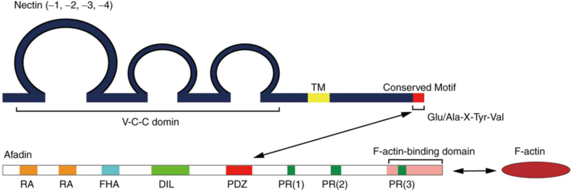 胞質(zhì)尾的C端都包含一個afadin (一種 F-肌動蛋白結(jié)合蛋白)結(jié)合基序,與Nectin-4不同的是,Nectin-1、Nectin-2、Nectin-3的afadin結(jié)合基序都是保守序列 Glu/Ala-X-Tyr-Val,可與 afadin的PDZ 結(jié)構(gòu)域結(jié)合;而Nectin-4可通過其C末端的 Gly-His-Leu-Val 基序與銜接分子afadin結(jié)合。當(dāng)Nectins與銜接分子afadin結(jié)合后,afadin會結(jié)合并募集絲狀肌動蛋白組件 (F-actin),從而促進(jìn)細(xì)胞與細(xì)胞之間的粘附。Nectin家族與鈣黏著蛋白共同作用,對粘著連接和緊密連接的產(chǎn)生和維持具有顯著影響,它們調(diào)節(jié)多種細(xì)胞行為,包括細(xì)胞粘附、生長、分化、遷移和凋亡。