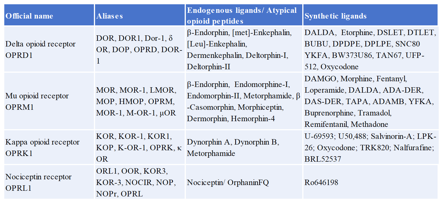 阿片受體(OPR) 屬于A類g蛋白偶聯(lián)受體,可被嗎啡等生物堿類阿片和內(nèi)源性配體如內(nèi)啡肽、腦啡肽等激活。OPR及其配體可見(jiàn)下表。